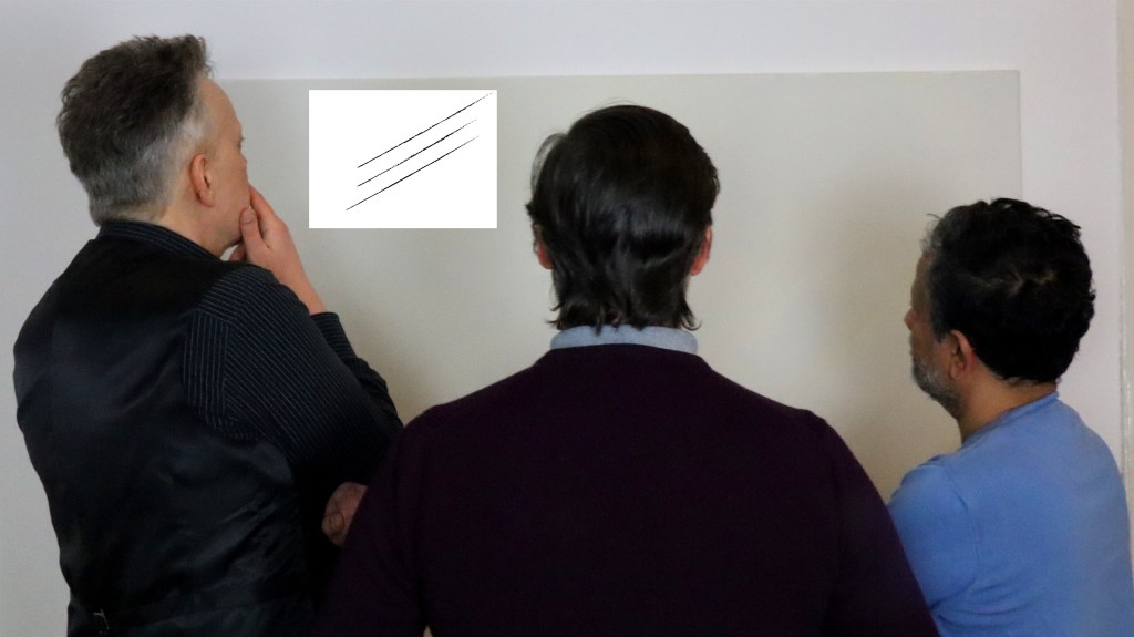 “Marc: My friend Serge has bought a painting. It’s a canvas about five foot by four: white. The background is white and if you screw up your eyes, you can make out some fine diagonal lines.